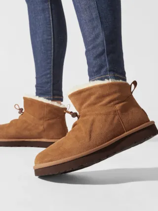 Botas de ante color marrón con forro interior de borreguito. - Diseño clásico. - Suela de goma. - Detalle de tira en el talón.