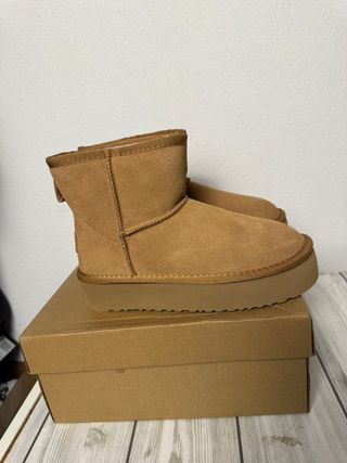 Botas de estilo UGG con suela de plataforma. - Exterior de ante. - Forro interior de pelo sintético. - Suela gruesa y cómoda. Únicamente dos usos.