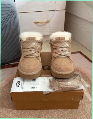 Botas UGG modelo Lowmel en color castaño y arena. Perfectas para un estilo casual y abrigado. - Detalle de cuadros en la lengüeta. - Forro interior de pelo suave. - Suela gruesa y cómoda. - Incluye cordones adicionales.