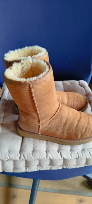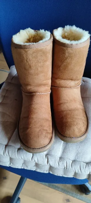 Botas UGG de color marrón para niña o mujer. Son de ante y tienen un forro de piel de oveja. Están en buen estado, aunque presentan algunas señales de uso. -Cierre de cremallera. -Suela de goma.