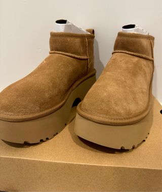 Botas de plataforma de la marca UGG en color beige, talla 39: - Plataforma de 5 cm, muy cómoda. - Parte superior de ante. - Forro interior UGGplushTM de 17 mm (80% lana reciclada, 20% lyocell). - Perfectas para el otoño e invierno. Son nuevas, sin estrenar.