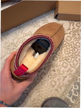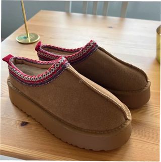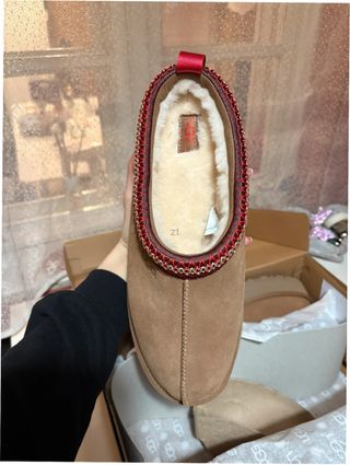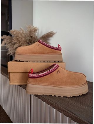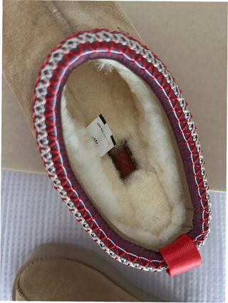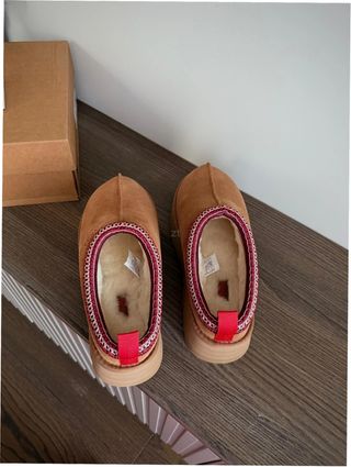 Pantuflas UGG de color marrón en talla 37. Perfectas para estar cómodo en casa. - Detalle de borde trenzado en rojo y beige. - Interior forrado de borreguito.