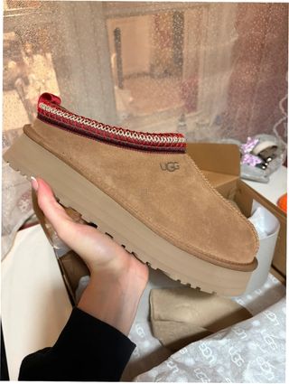 Zapatillas UGG de ante en color beige y marrón. - Detalle de borde con hilo rojo y beige. - Suela gruesa y cómoda.