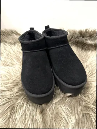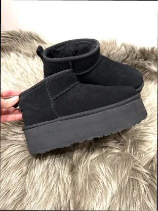 Zapatos tipo botas de plataforma estilo UGG en color negro. - Exterior de ante. - Forro interior de pelo sintético. - Suela gruesa de goma. - Detalle de logo en el talón. Solo se han usado 1 día