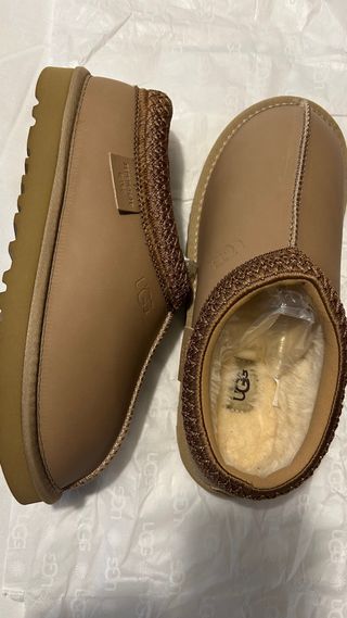 Botas estilo zueco de la marca UGG en color beige. Perfectas para estar cómodo en casa. Nuevas sin estrenar completamente nuevas - Exterior de piel. - Forro interior de pelo sintético. - Detalle de tejido trenzado en el cuello. - Suela de goma.