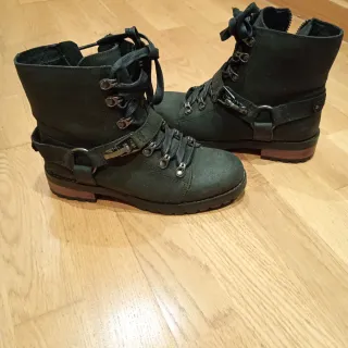 Botas de estilo militar en color negro. - Cierre con cordones y cremallera lateral. - Detalle de hebilla y correa. - Suela de goma. Precio no negociable