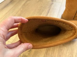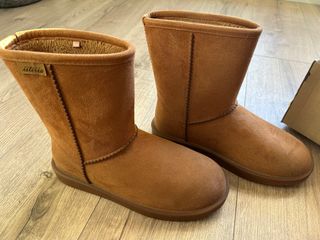 Botas tipo UGG en color camel, forradas y de la talla 41 (queda como una 40) marca Natura. - Exterior de ante sintético. - Forro interior de pelo sintético muy suave. - Suela de goma antideslizante. - Caña de 15 cm. Tienen poco uso y solo para estar por casa. Tallan pequeñas.