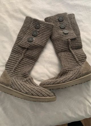UGG Classic Cardy en color gris, talla 38 pero calza grande y vale también para 39. Son botas de punto tipo suéter muy cómodas y versátiles: puedes llevarlas estiradas hasta la pantorrilla, ligeramente caídas o con una vuelta. Muy buen estado, poco uso. No hay agujeros ni manchas visibles importantes. Las medidas son: suela 27,5 cm, largo 11 cm, alto (caña) según cómo las lleves (ver fotos). Envío rapido. • Material: punto de mezcla de lana (incluye lana de merino) + nylon/gamuza en refuerzos. • Plantilla mullida de lana merino para calor y confort. • Suela Treadlite™ de UGG, ligera y con buena amortiguación. • 3 botones