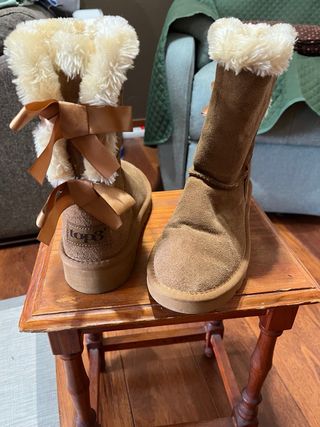 Botas Ugg,están como nuevas,se pusieron un invierno,porque a mi hija le crece el pie,están rozadas en la punta,porque es una niña,pero están impecables.Son muy chulas por los lícitos,cómodas y calientitas.