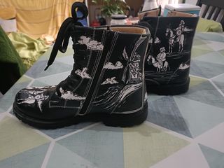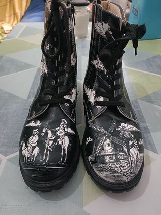 Se han usado quatro veces. Son un 40 un poco pequeño y yo calzo 40,5 Botas veganas con un diseño único inspirado en el Quijote. - Estampado blanco y negro. - Cierre con cordones. - Suela de goma.