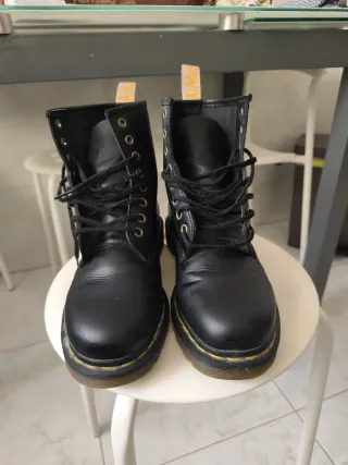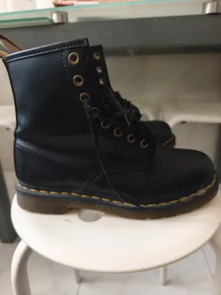 Botas estilo Dr. Martens, modelo vegano. - Casi como nuevas, muy poco usadas, las vendo porque me quedan pequeñas. - Diseño de caña alta. - Ojales metálicos dorados. - Cordones negros. - Suela con pespunte amarillo característico.