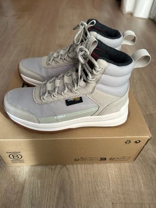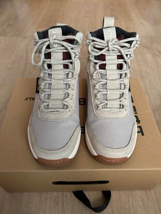 Botas modelo Tietaralf de Ecoalf. - Color beige y gris. - Cierre con cordones. - Caña alta. Veganas y fabricadas con materiales reciclados. Tejido Cordura. Cordones de repuesto. Fue un regalo. Me quedan pequeñas. Precio original: 189’90€.