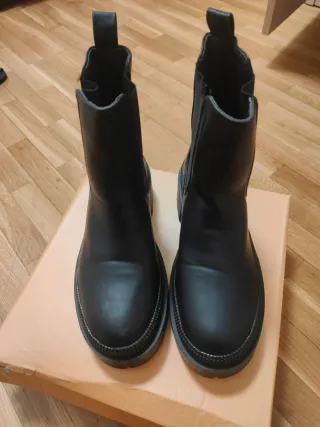 Botines de piel vegana en color negro. Solo puestos una vez!!! - Diseño Chelsea. - Suela gruesa y cómoda. - Tirador trasero para facilitar su puesta.