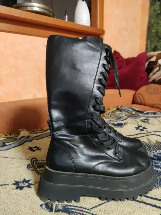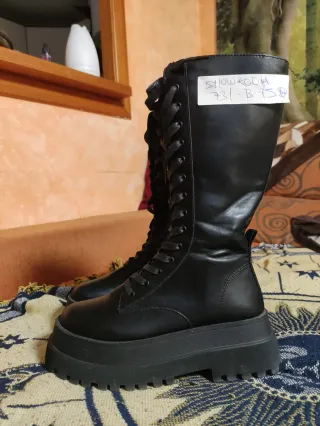 Botas militares altas de estilo showroom. Cuentan con un diseño moderno y llamativo.puestas para fotos.38-39,según anchura de pié - Cierre de cordones. - Plataforma gruesa. - Caña alta. Cremallera lateral. Piel vegana con mejor resultado que la polipiel habitual