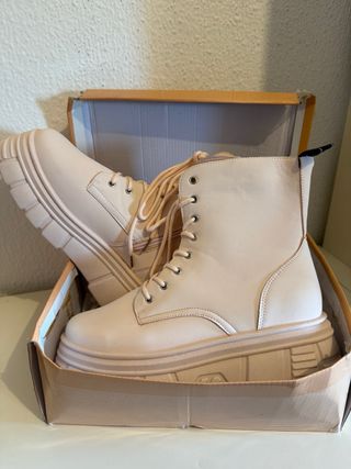 Botas de piel vegana en color bruna rosa. ( rosa clarito ) - Diseño de caña alta. - Suela gruesa y robusta. - Cierre con cordones. Nuevas a estrenar en su caja original, ( la caja está un poco dañada ) llevan otras plantillas de regalo.