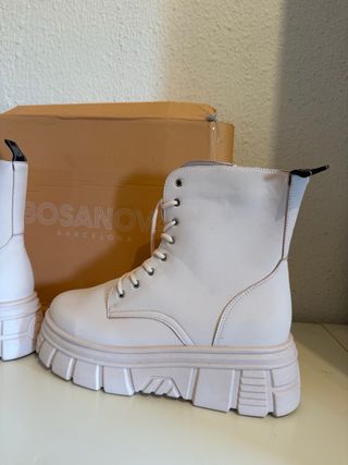 Botas tipo militar en piel vegana negras talla 38, marca Bosanova. Suela de plataforma de 3.5 cm y 4.5 cm en el tacón. Con cordones y cremallera lateral. Altura de la caña 15 cm. Costura de la suela en color blanco. Me las he puesto solo una vez, están como nuevas, la suela sin desgastar. La bota derecha tiene un roce leve en la puntera (ver última foto). Caja original.