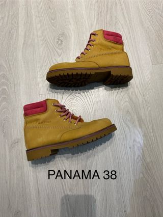 Botas de la marca Panama en talla 38. Un calzado resistente y con estilo. - Combinación de colores amarillo y rojo. - Diseño tipo botín. - Cierre con cordones.