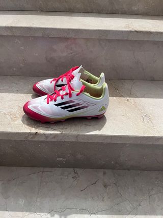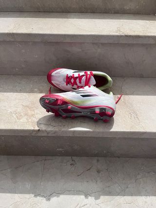 Botas de fútbol Adidas F50 con cordones rosas. - Diseño en blanco con detalles en rosa y negro. - Suela con tacos para césped.