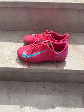 Botas de fútbol Nike con un diseño llamativo. - Color principal rosa vibrante. - Detalles en color turquesa. - Cierre con cordones. -Usadas 1 vez