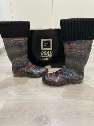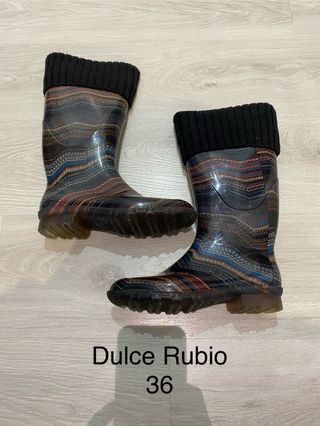 Botas de agua de la marca Dulce Rubio con un diseño llamativo. - Estampado zig-zag multicolor. - Detalle de tejido negro en la parte superior.