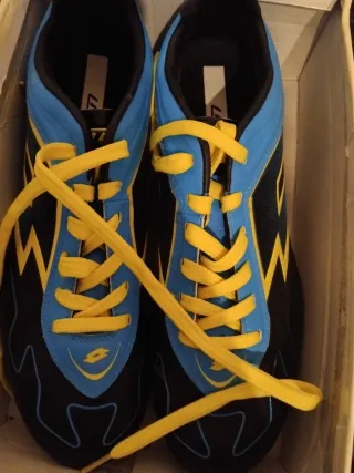 Botas de fútbol Lotto con un diseño llamativo. - Combinación de colores negro y azul. - Cordones amarillos. - Logo de Lotto en la lengüeta y en la puntera.