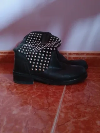 REGALO, con la compra de otra cosa de mi perfil, (pregunta sin compromiso). El precio es por activar el envío. Botines de piel con un diseño cowboy de punta roma y detalles metálicos. - Material: Piel. - Color: Negro con tachuelas doradas y plateadas. -Caña forrada y plantilla interior de cuero.