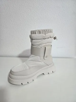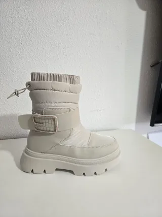Botas de invierno de color beige con un diseño moderno y práctico. Impermeable Ideales para lluvia ,frio nieve Forrada por dentro de pelo Mas numeros disponibles preguntar sin compromiso Medidas de plantilla interior 26, 3m - Cierre con cordón ajustable en la parte superior. - Correa decorativa con hebilla y detalle de pedrería. - Suela gruesa tipo track para mayor agarre. - Material exterior sintético y acolchado.