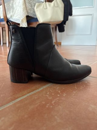 Botas de cuero negro con tacón de madera. - Diseño elegante y versátil. - Cierre elástico lateral para mayor comodidad. - Tacón de bloque con acabado de madera.