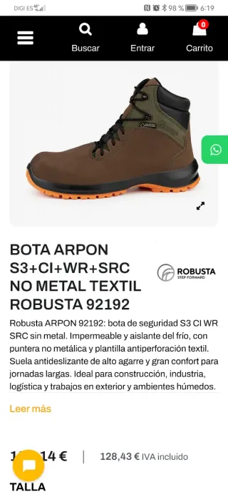 .BOTA ARPON Goretex S3+CI+WR+SRC NO METAL TEXTIL ROBUSTA 92192 Robusta ARPON 92192: bota de seguridad S3 CI WR SRC sin metal. Impermeable y aislante del frío, con puntera no metálica y plantilla antiperforación textil. Suela antideslizante de alto agarre y gran confort para jornadas largas. Ideal para construcción, industria, logística y trabajos en exterior y ambientes húmedos.