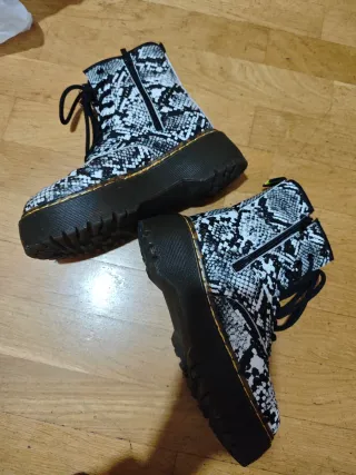 Botas con un llamativo estampado de serpiente en blanco y negro. Tienen una suela gruesa y cordones. - Diseño de serpiente. - Suela de plataforma. - Cierre de cremallera lateral.