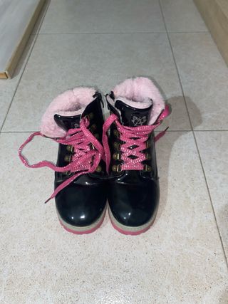 Botas de invierno con forro interior suave y cordones brillantes. - Exterior de charol negro. - Forro interior de pelo sintético rosa. - Cordones rosas con purpurina. - Suela de goma con detalles rosas.