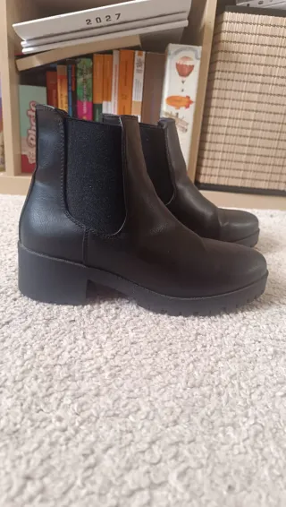 Botas de cuero negras con suela gruesa. - Diseño tipo chelsea. - Material exterior de cuero. - Suela de goma antideslizante.