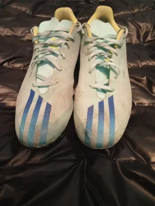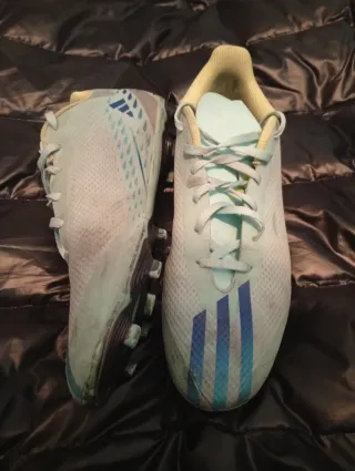 Zapatillas Adidas X Speedflow.3 FG en color verde y azul. Zapatillas de fútbol Adidas – buen estado Vendo zapatillas de fútbol Adidas originales, color azul claro/blanco. Usadas pero en buen estado, con desgaste normal de uso Muy ligeras y cómodas, Suela con tacos firmes, todavía con mucha vida por delante. Ideales para entrenamientos o partidos. Las vendo porque ya no las uso. Entrega en mano 💬 Cualquier duda, escríbeme.