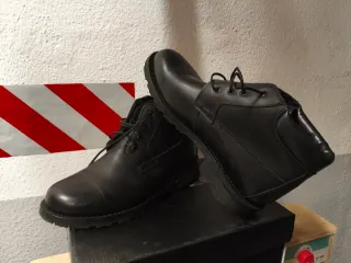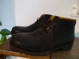Botas de trabajo numero 48 para pie de 29 cm. Suela de goma dura de verdad, nada de esa porqueria de vibram que al año se cae a cachos y es pringosa. Solo una puesta.