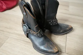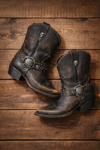Hebilla cinturón metalica, detalle botas vaqueras