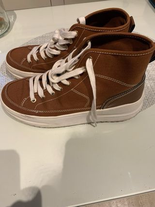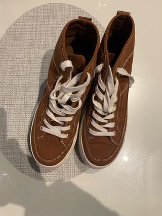 Zapatillas de bota de tela en color marrón. Cuentan con cordones blancos para un ajuste seguro y un diseño moderno. - Material exterior de tela. - Cierre con cordones. - Diseño de bota alta.