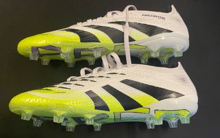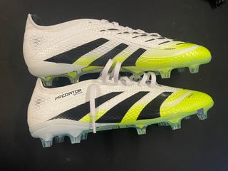 Botas de fútbol Adidas Predator de gama Élite con tacos FG. - Diseño en blanco y amarillo. - Modelo Predator Élite FG. - No tienen caja son solo las botas