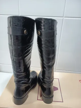 Botas altas de charol con un diseño elegante. - Material exterior de charol brillante. Son de piel. - Detalle texturizado en la parte superior. - Cierre de cremallera lateral. - Adorno con botón dorado.