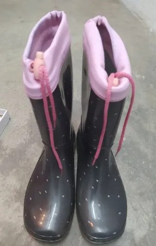 Botas de agua para proteger tus pies en días de lluvia. Tienen un diseño divertido con lunares. - Detalle de cordón ajustable en la parte superior. - Forro interior suave para mayor comodidad.