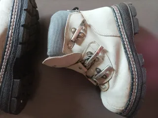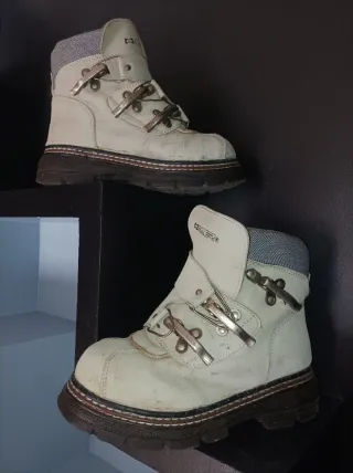 Botas estilo ravero con un diseño muy parecido a las Art Company de hebillas. De la marca Hamer de los años 90/2000 - Parte superior en color beige. - Cierres y detalles metálicos plateados. - Cuello de la bota con tejido estampado. Están muy poco usadas. Los signos de uso son superficiales como pelado, pero por dentro están nuevas.