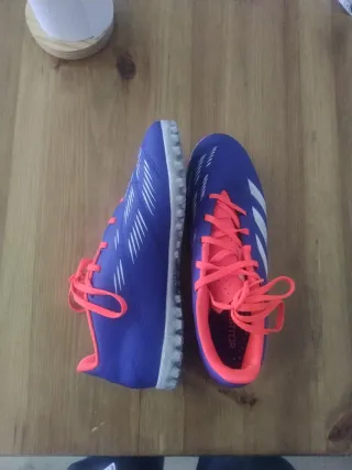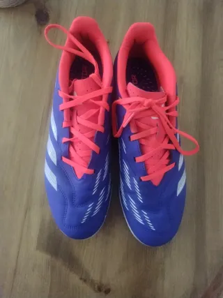 Botas de fútbol multitaco Adidas Predator en llamativos tonos azules y morados. Perfectas para jugar en césped artificial. - Diseño deportivo. - Cordones naranjas. - Suela multitaco.