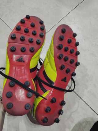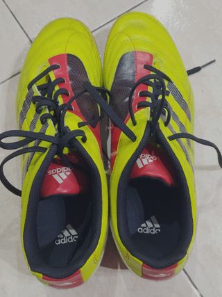 Botas de fútbol Adidas Predator en llamativos tonos amarillos y rojos. Perfectas para destacar en el campo. - Diseño con las icónicas tres rayas de Adidas. - Detalle de color rojo en la lengüeta y talón. - Cordones negros para un ajuste seguro. Bastante usadas pero bien conservadas.