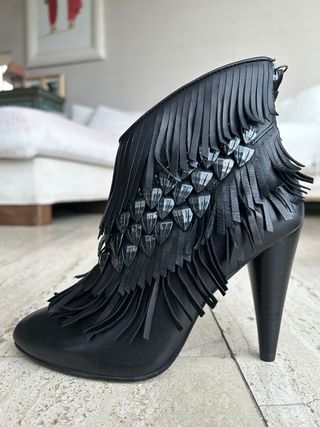 Botines de tacón con un diseño llamativo y moderno. - Comprados originalmente por 270€ - Detalle de flecos. - Adornos tipo escamas. - Tacón alto y grueso.