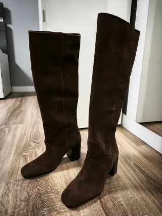 Botas de tacón altas, con un diseño elegante y moderno. - Material: Ante. - Color: Marrón. - Tacón: De altura media.