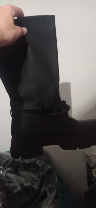 Botas altas de color negro con detalle de cadena. - Diseño moderno y elegante. - Suela gruesa y resistente. - Caña alta.