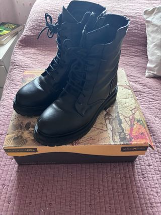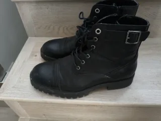 Botas de estilo militar de la marca Jack & Jones, en color negro. Han sido usadas muy pocas veces y se encuentran en excelente estado. - Cierre con cordones. - Detalle de hebilla lateral. - Suela de goma resistente.
