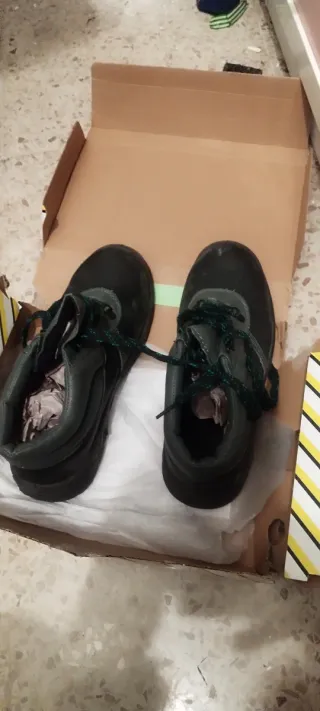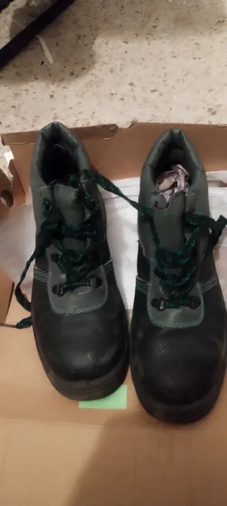 Par de botas de seguridad con cordones. - Usadas solo durante 4 horas y sobre piso de terrazo, ( ya no volví a trabajar más en esta, pero la empresa me dió la ropa laboral porque es un EPI) - Diseño en color negro y verde. - Cierre con cordones.