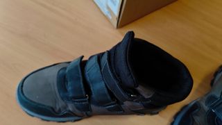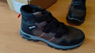 Botas de montaña / invierno TEX de Carrefour, talla 43, color marrón y negro con detalles en naranja. Material sintético tipo polipiel, forro textil caliente y suela con buen taco. Cierre cómodo con tres tiras de velcro. Solo tienen un uso, están como nuevas y se guardan en su caja original. No les doy uso y prefiero venderlas antes de que sigan en el armario. Entrega en mano en Ciudad Real o envío (gastos a cargo del comprador). - Cierre de velcro para un ajuste rápido. - Detalle de costuras en contraste. - Tirador trasero para facilitar su puesta. - Suela con buen agarre.