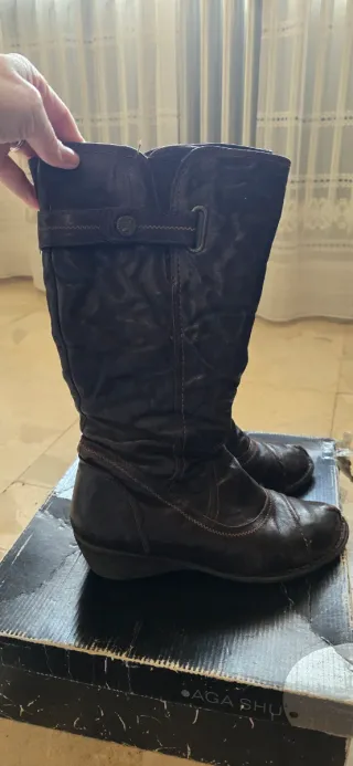 Botas de piel marrones con una pequeña cuña. Han sido usadas muy pocas veces. - Material exterior de piel. - Diseño de caña alta. - Detalle de correa y hebilla en la parte superior.