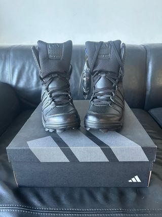 Botas tácticas Adidas GSG 9.2 en color negro. IMPERMEABLES. Nuevas a estrenar! - Diseño caña alta para mayor soporte y sujeción. - Incorpora tecnología Climaproof para protección transpirable e impermeable. - Mediasuela de EVA aporta amortiguación eficaz. - Suela con tacos Traxion ofrece agarre excepcional. - Plantilla OrthoLite antimicrobiana para mayor ventilación. - Cierre con cordones. Observaciones: Este modelo talla pequeño.